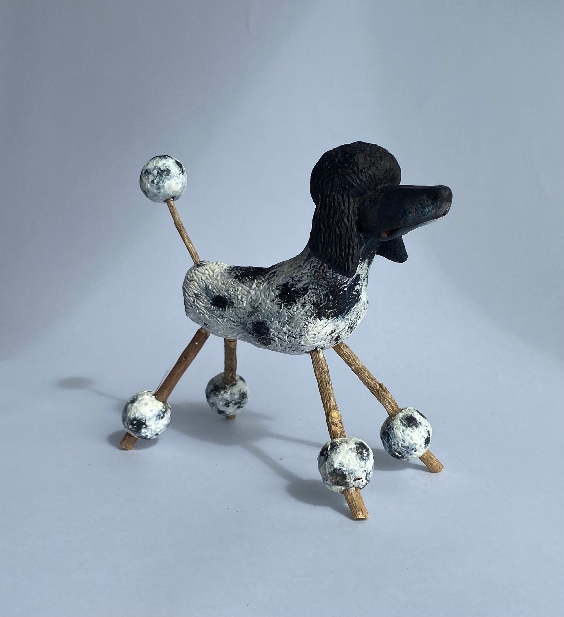 Body is made from kiln fired clay, hand painted with bespoke natural wood/bark legs.