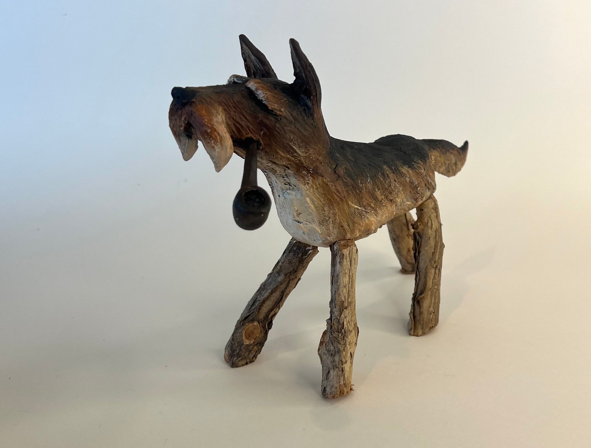 Body is made from kiln fired clay, pipe is made from polymer clay, both body and pipe are hand painted, with natural wood/bark used for the legs.